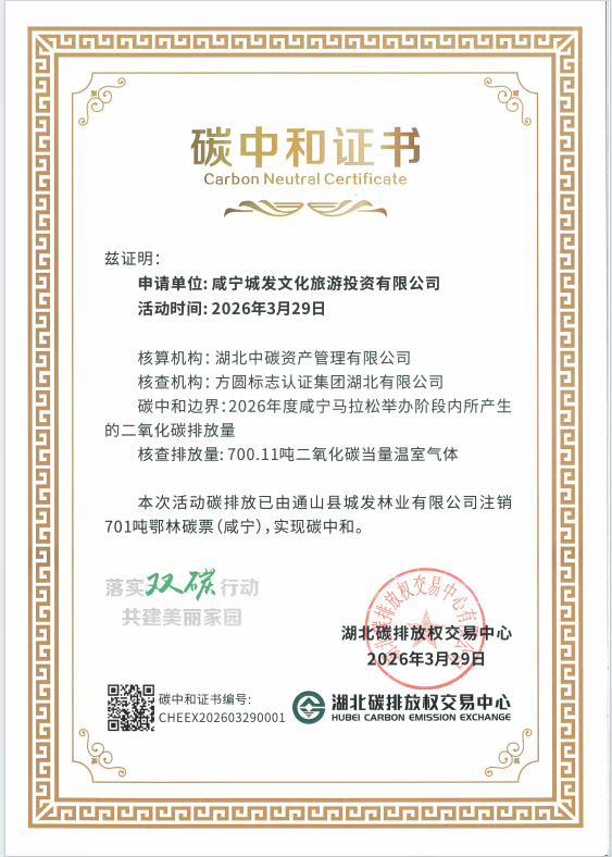 本次賽事中,集團創(chuàng)新采用咸寧市林業(yè)局捐贈的“鄂林碳票”抵消賽事碳排放,有效銜接賽事碳排放與區(qū)域碳匯資源,實現(xiàn)了“賽事減排+碳匯抵消”的閉環(huán)管理。經(jīng)專業(yè)機構科學核算,本次賽事累計碳排放約700.11kgCO?e,所有碳排放均通過咸寧本地碳票全額抵消。隨后,集團正式提交碳中和申請,咸寧市林業(yè)局出具碳抵消證明,湖北碳排放權交易中心為賽事頒發(fā)碳中和證書,正式確認本次賽事實現(xiàn)“零碳排放”——這也是咸寧市體育賽事首次獲得權威部門碳中和認證,標志著咸寧大型賽事綠色辦賽水平邁上新臺階。